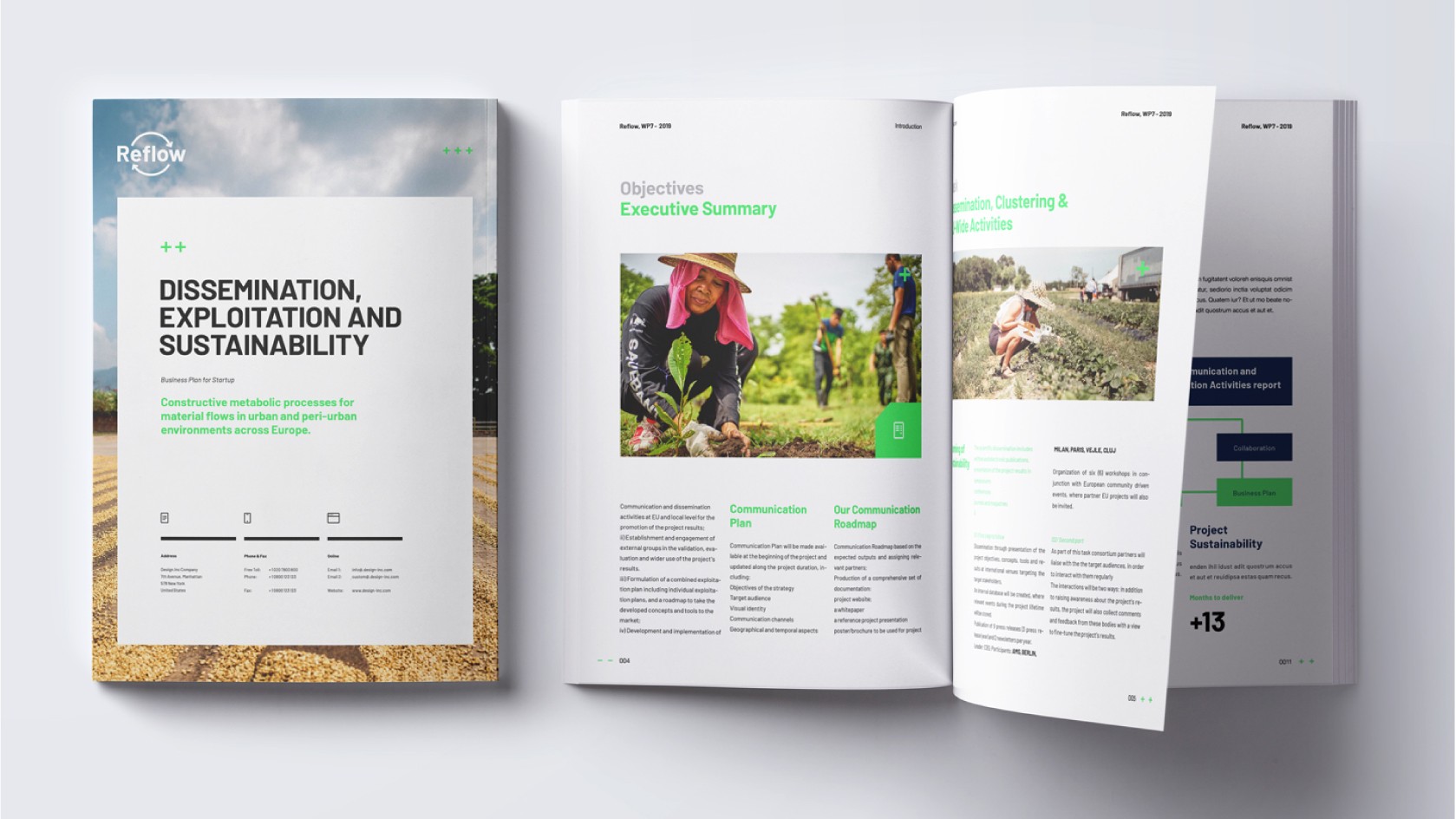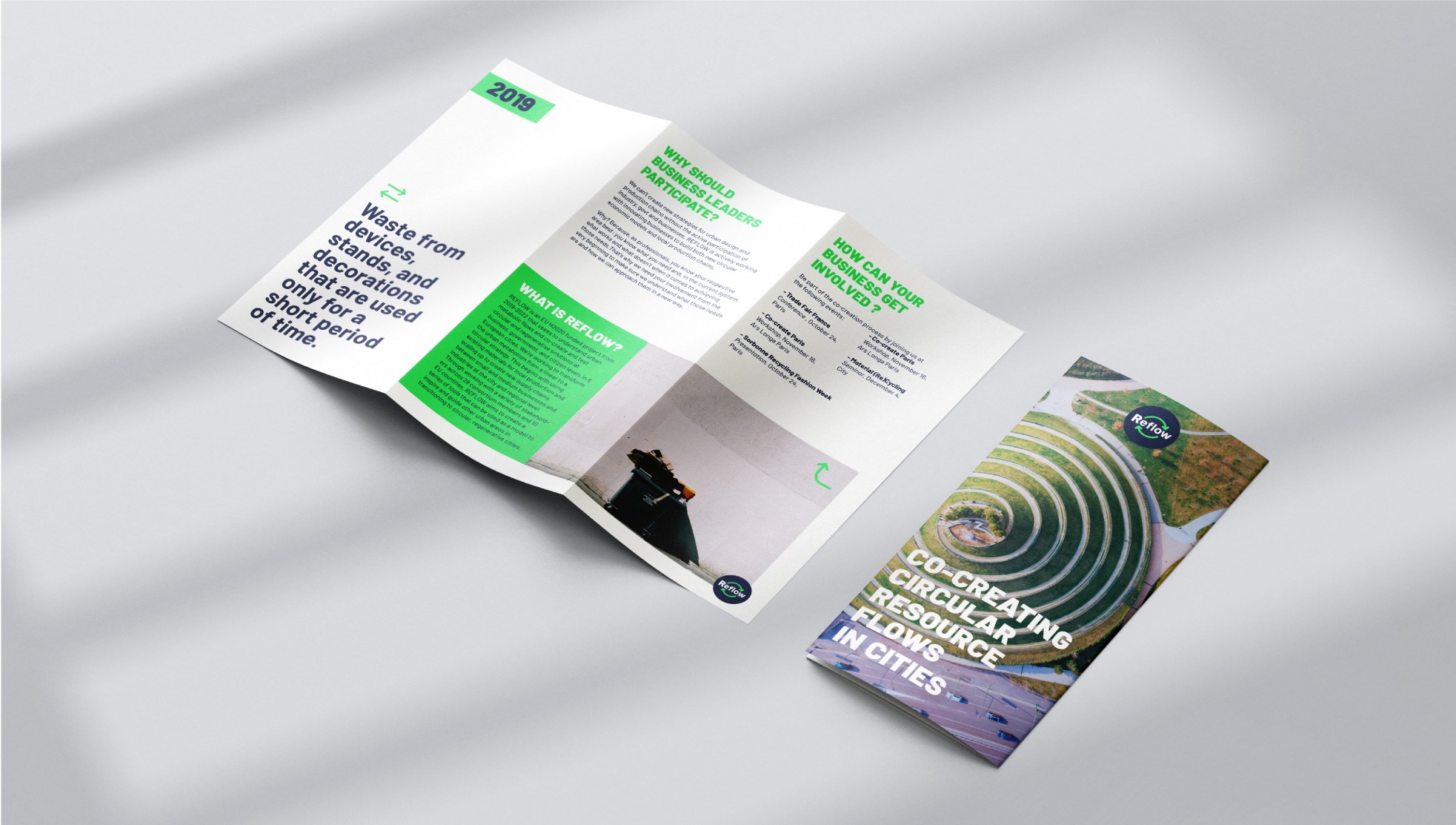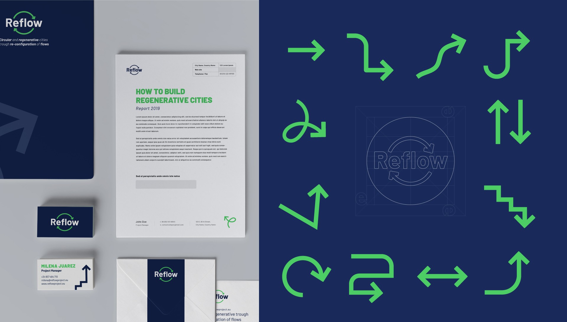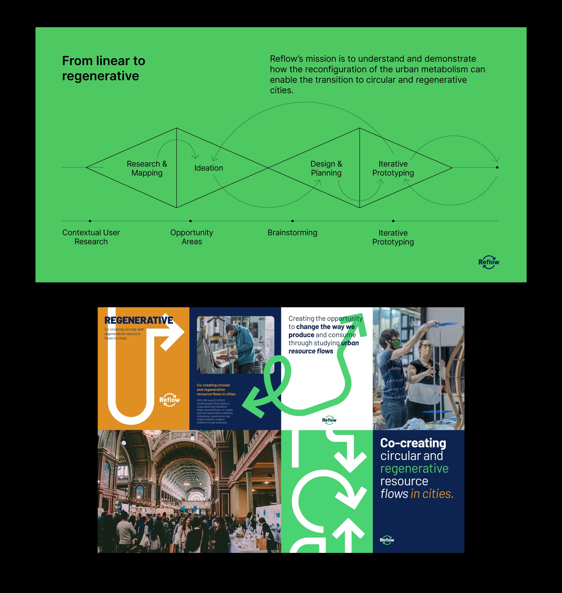 The visual design for REFLOW was collaboratively developed by [Your Name] and a coworker. This work was crucial in crafting the visual identity of the project, ensuring that the concepts of urban metabolism and circular economies were visually communicated in a clear and engaging manner across various media and platforms.