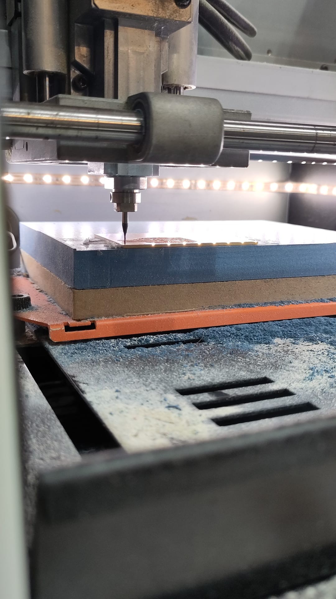 I started with the inner lines and using the 1/64 end mill, it was really easy to put inside the collet, kind of adding a new needle in a sewing machine. Then, after adding the files, in the first 10 seconds I realise that the end mill was scratching the copper but leaving a shinny look, this means the end mill was not going deep enough and I stop the machine, with the collet put it a bit lower and start again the file, It cut about 15 minutes until the end mill broke :( I had to change the broken end mill and add a new one, we checked with help and it could have being a used end mill or was not completely flat from the surface. After reloading the file, the first part I adjusted the speed to 40% until it reach the point the need to cut from 0 and speed it up 60%, I wasn’t in a rush and didn’t wanted to break another tool, so I send it to this speed.