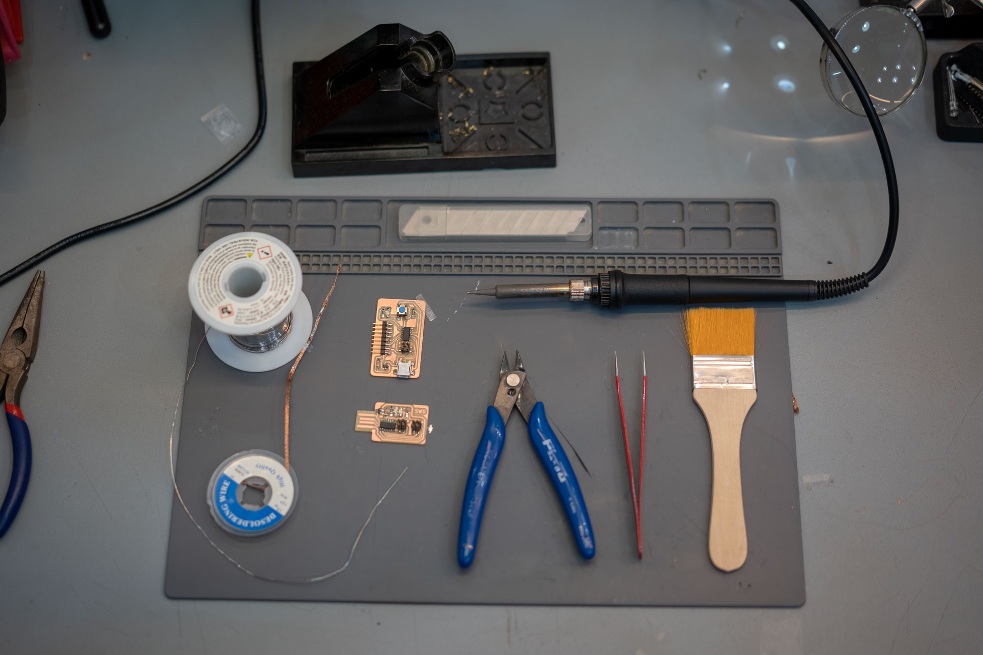 For this first experience, my hands shaked so much, I try to grab the tweezers or the tin in one side and the solder iron in the other one. So most of the pieces are croocked, specially the small ones and in the case of the SAMD that it has multiple tiny legs, it was extremely difficult to add the solder without creating a link between different legs that where next to each other. So in this case, with the desolder wire, I had to take out a lot of the excess.